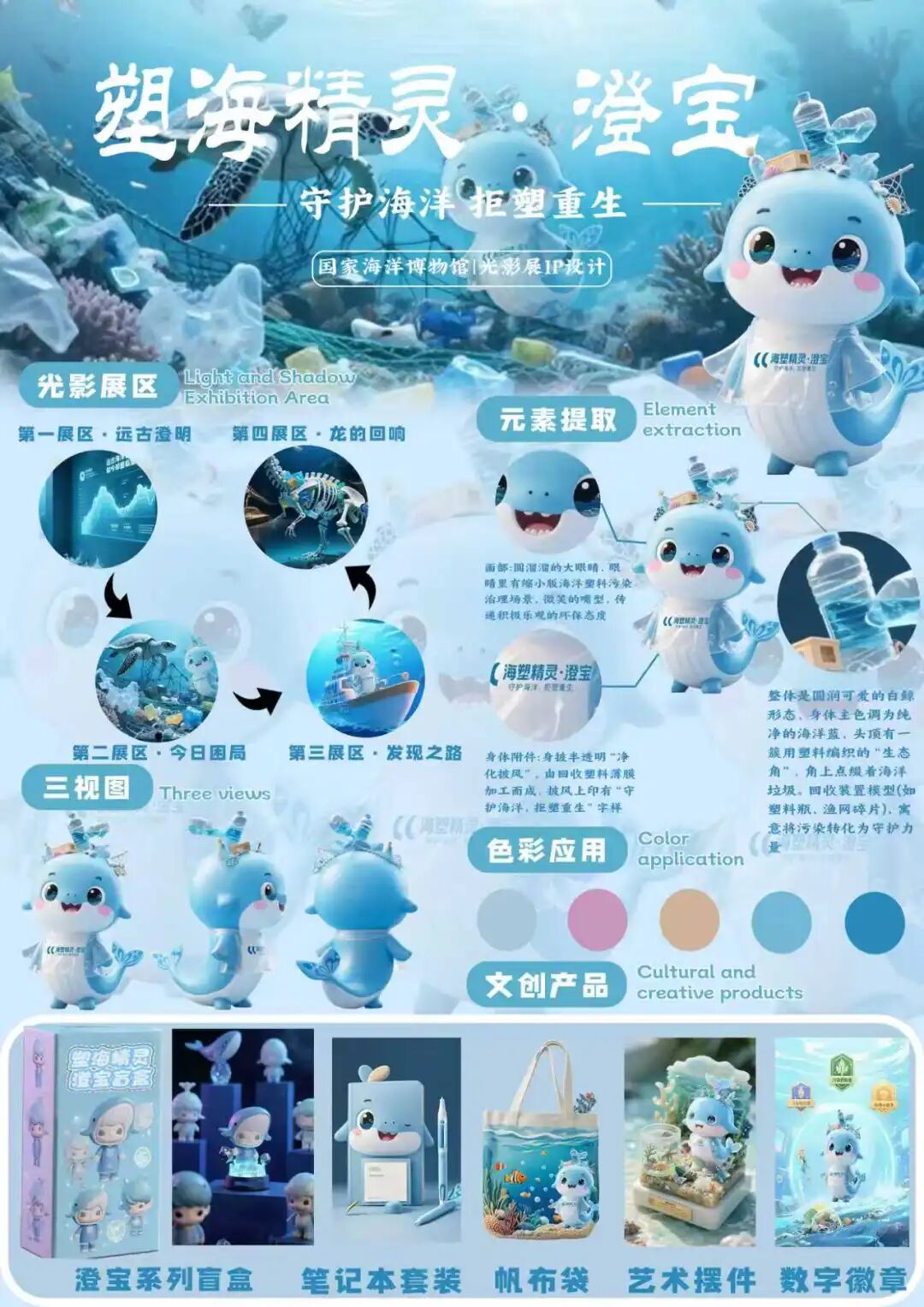 海洋塑料污染被称为“第八大陆”,是我们无法忽视的危机,本项目以国家海洋博物馆为基础,加入海洋光影展,从而衍生出我们的塑海精灵:澄宝。以国家海洋博物馆的白鲸为原型,外观圆润可爱又加入塑料回收与海洋生态元素。在此基础上,设计出有关的实用文创、收藏文创以及数字文创,兼具艺术价值与环保意义。