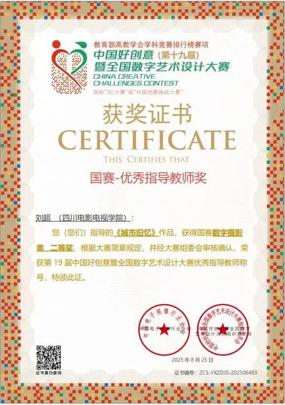 同时,在刘超老师指导学生完成此作品时,因其高超的指导水平和认真负责的态度,在众多指导老师中脱颖而出,根据大赛简章规定,并经大赛组委会审核确认,荣获第19届中国好创意暨全国数字艺术设计大赛优秀指导教师称号!