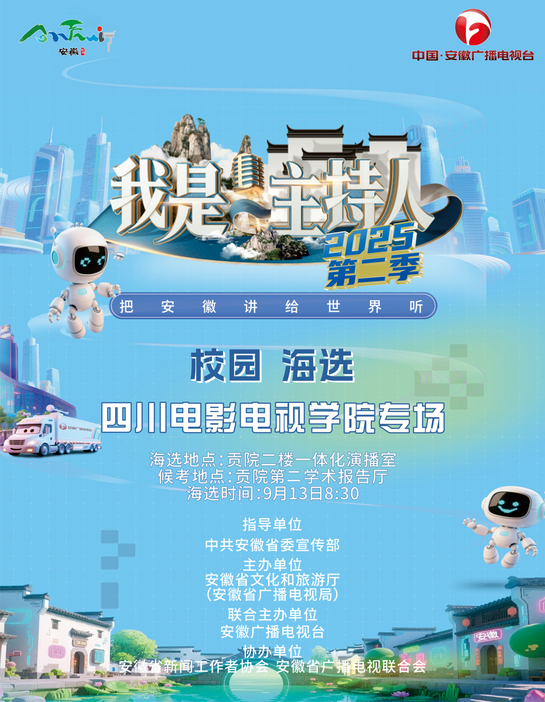 2025年9月13日,由中共安徽省委宣传部指导,安徽省文化和旅游厅(安徽省广播电视局)与安徽广播电视台联合主办的“我是主持人· 2025第二季”校园海选在四川电影电视学院(金牛校区)举行。本次选拔以“将安徽讲给世界听”为主题,吸引众多川影学子踊跃参与。