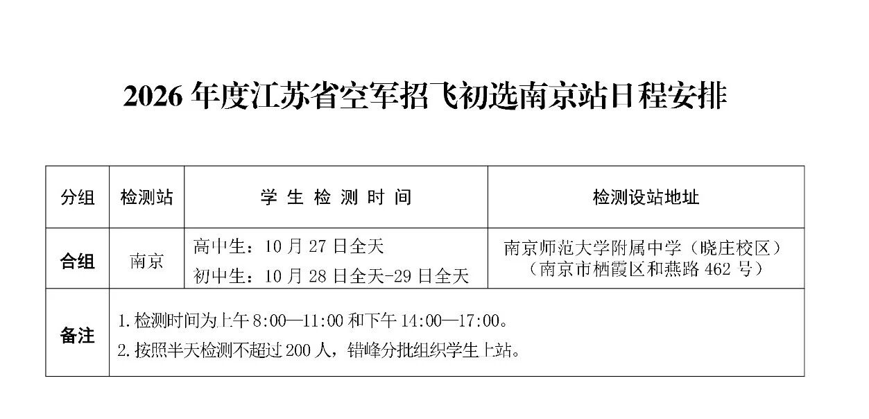 根据2026年度空军招飞工作安排,10月27日至10月29日,空军招飞局南京选拔中心将派初选组在南京设站对南京市报考空军飞行学员和江苏省空军青少年航空学校的军校生、高中生、初中生进行检测。