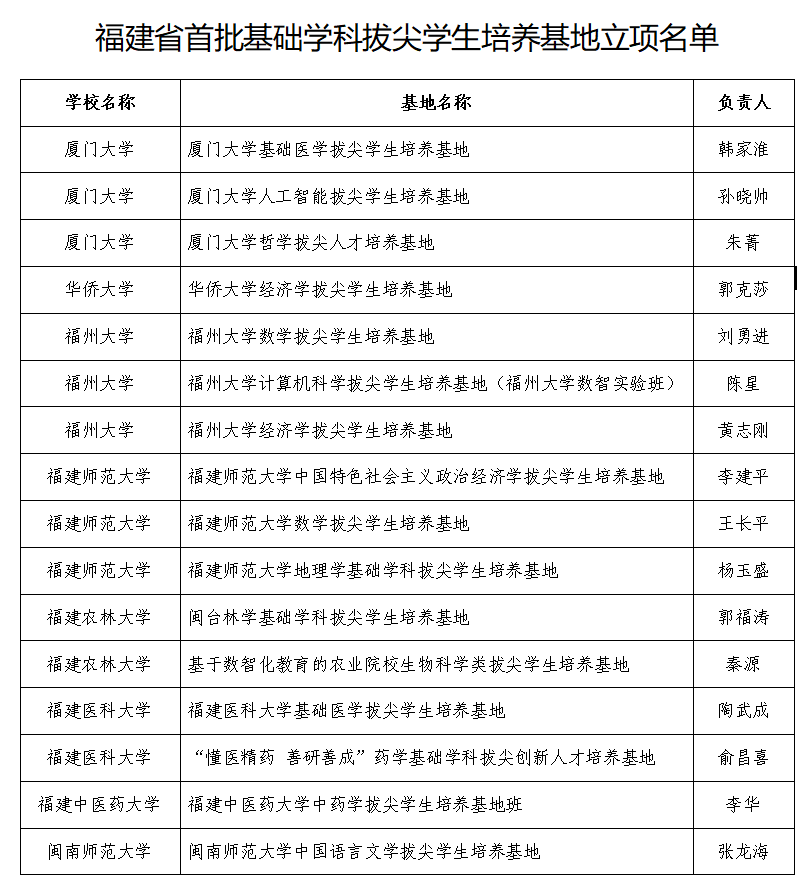 根据《福建省教育厅办公室关于开展基础学科拔尖学生培养基地建设的通知》(闽教办高〔2024〕15号),经学校推荐、专家评审,确定首批基础学科拔尖学生培养基地16项,现将名单予以公布。