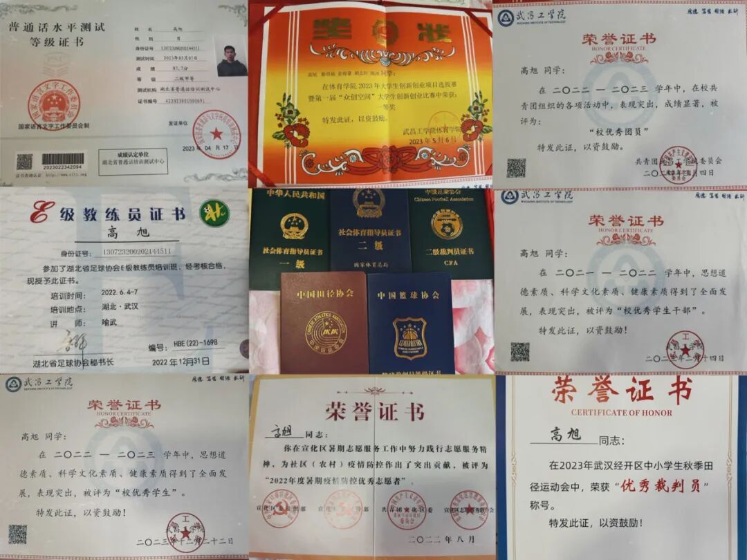 高旭始终秉持虚心向学、精益求精的态度,学业成绩四年稳居班级前列。在专业领域,他主动精进专项技能,成功考取篮球裁判员、足球教练员(兼裁判员)、田径裁判员等多项专业资质。同时,他积极拓展综合素养,相继通过全国大学英语四六级、全国计算机二级、普通话二甲等技能考试。凭借优异的学业表现和全面提升,高旭多次斩获奖学金以及校“优秀学生”等荣誉称号。