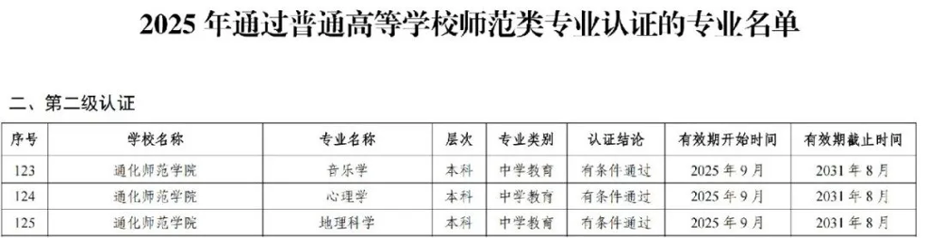 (新闻网讯 教务处报道)近日,教育部办公厅印发《关于公布2025年通过普通高等学校师范类专业认证专业名单及中期审核专业名单的通知》(教师厅函〔2025〕18号),我校师范类专业建设再添新成果——音乐学、心理学、地理科学3个专业顺利通过师范类专业第二级认证,认证结论有效期为六年(自2025年9月至2031年8月);历史学、汉语言文学、学前教育3个专业成功通过师范类专业认证中期审核,审核结论为继续保持原认证有效期。