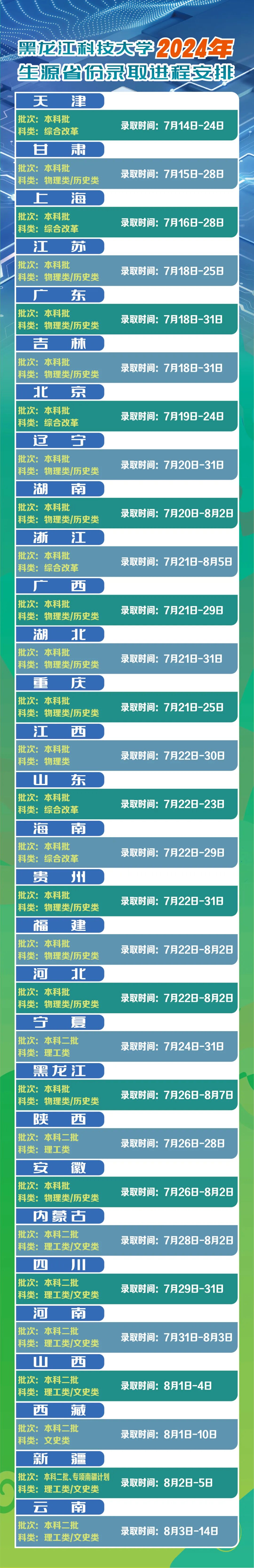 为了方便考生了解录取时间,知晓是否被心仪的黑龙江科技大学录取,现将生源省份录取进程及结果查询方式公布如下。