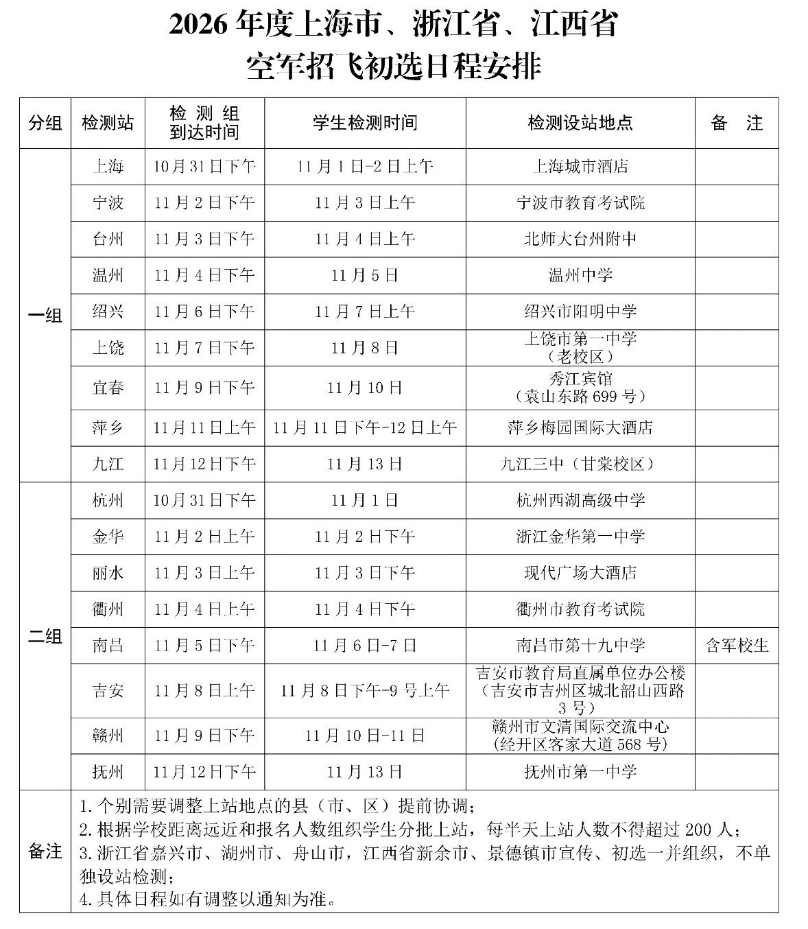 根据2026年度空军招飞工作安排,11月1日至11月13日,空军招飞局南京选拔中心将派初选组赴上海市、浙江省、江西省等地,对报考空军飞行学员的学生进行检测。