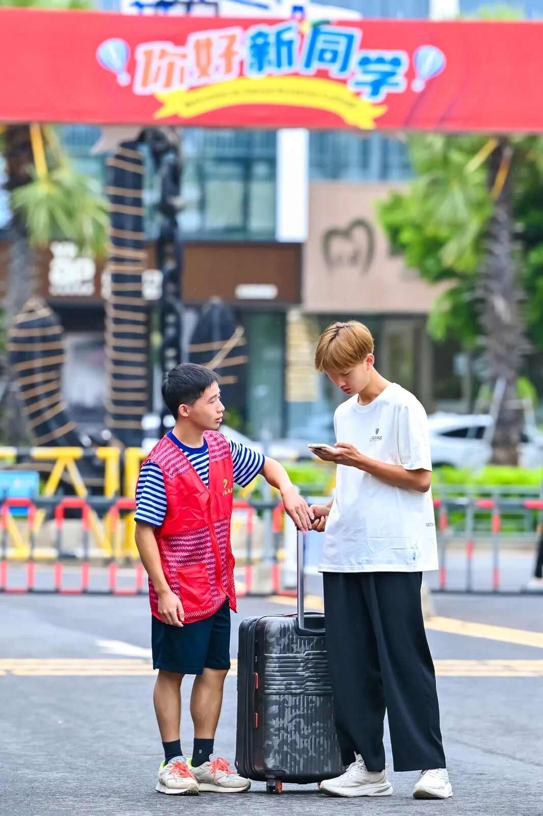 刚下车的新生还没来得及卸下肩上的背包,几位学长便快步上前接过沉重的行李箱,“报道点往这边走,我带你过去,手续很快的!” 一句热情的招呼,瞬间驱散了新生初来乍到的局促。