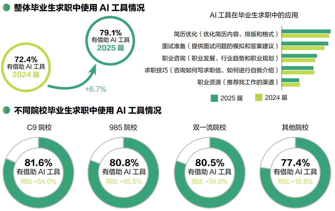 在求职这场个人与市场的博弈中,2025届毕业生普遍装备了名为“AI”的新式武器。79.1%的毕业生在求职过程中使用了AI工具,这一比例相较2024届猛增了6.7个百分点。