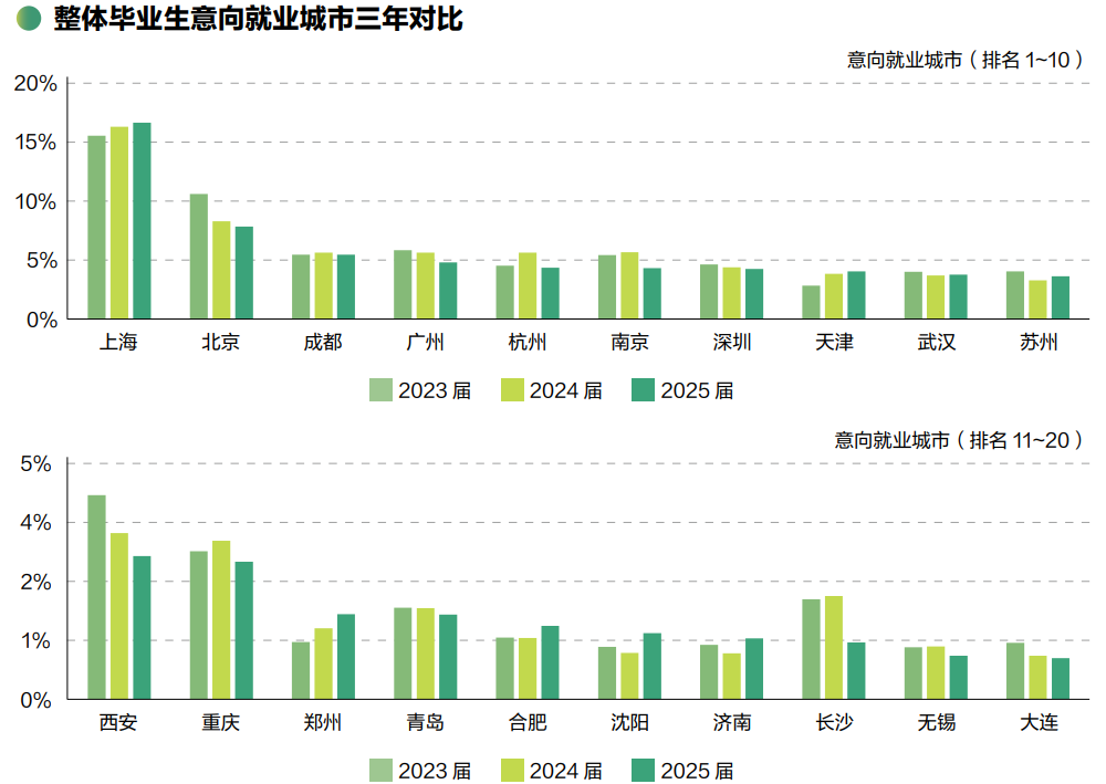 而在城市选择上,虽然上海、北京、成都稳居前列,但一个明显的趋势是人才的地域流动性更加分散和理性。异地就读的广州、杭州、成都等地生源表现出强烈的回乡意愿,这意味着新一线城市的人才吸引政策正在生效,毕业生们正在多元选项中寻找事业发展与生活品质的最优解。