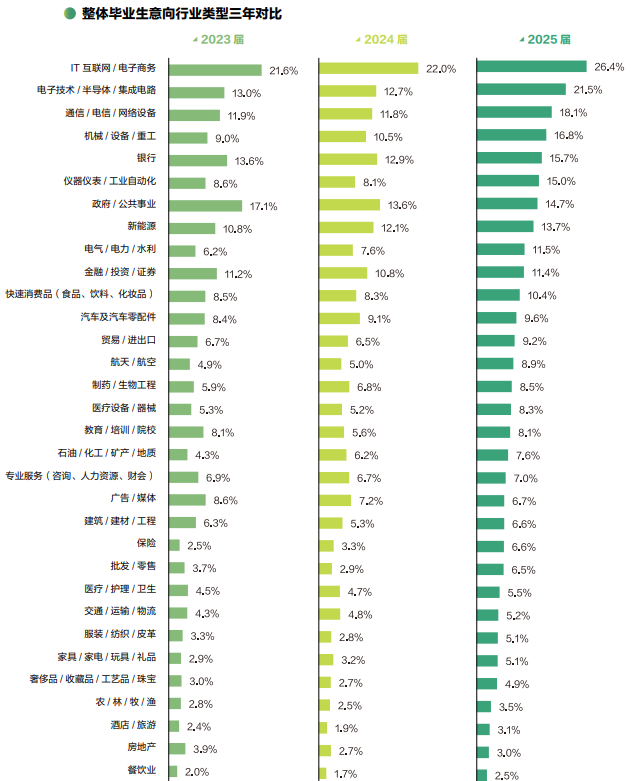 这种价值取向也清晰地反映在他们的行业和城市选择上。IT/互联网、电子技术/半导体、新能源等行业因其广阔前景持续火热。