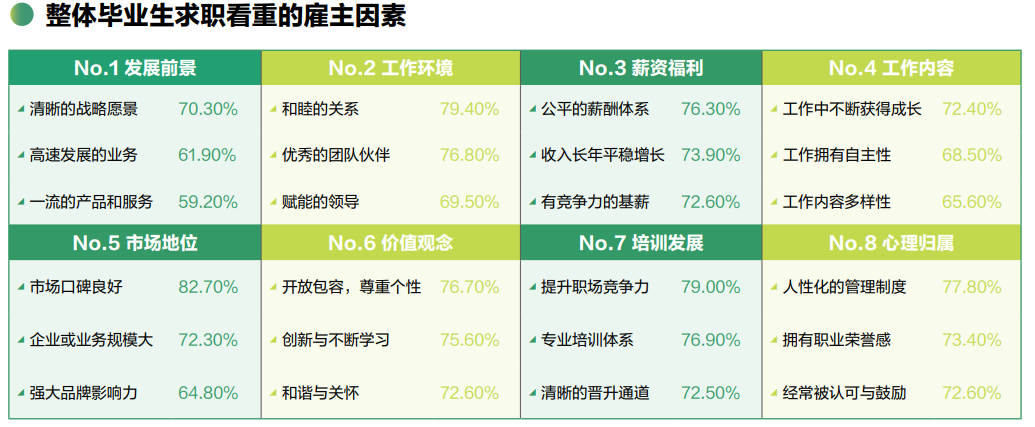 在最看重的雇主因素排名中,“发展前景”高居榜首,其下“清晰的战略愿景”(70.3%)是关键;“工作环境”紧随其后,其中“和睦的关系”(79.4%)备受珍视;而“薪资福利”仅位列第三。