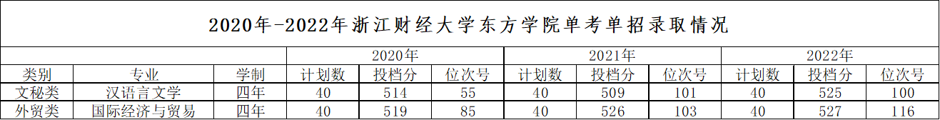 2020年-2022年浙江财经大学东方学院单考单招录取情况