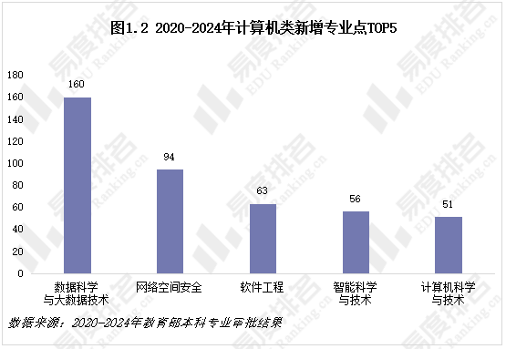 人工智能、大数据、网络安全等新兴技术方向崛起,许多高校在申请新增专业点时,会更倾向于这些前沿和紧缺领域。近些年,数据科学与大数据技术专业新增招生专业点数量远超其他计算机类专业。