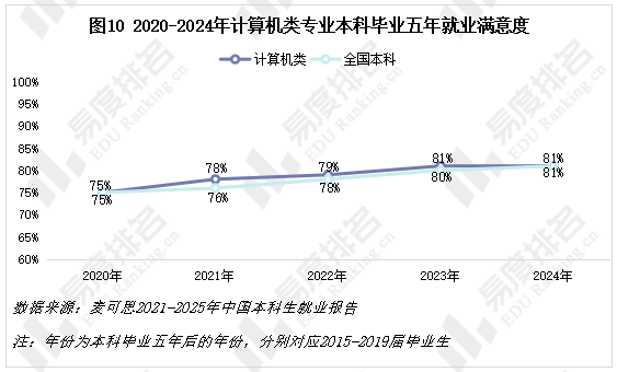 计算机行业虽然薪资高于全国本科平均薪资,但行业内卷、长期的996、长时久坐等,拿着高薪的同时又深刻承受着健康损耗、生活失衡等行业通病。计算机类本科毕业生毕业五年后的就业满意度基本与全国本科持平。