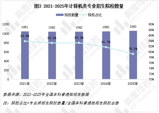 计算机类专业招生院校数量稳定在1050所左右,院校数量占比下降。这体现了我国高等教育的规模仍在稳步扩大,计算机类招生院校的数量保持稳定使得其相对份额被稀释,出现了占比下降的情况。