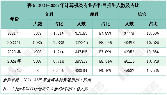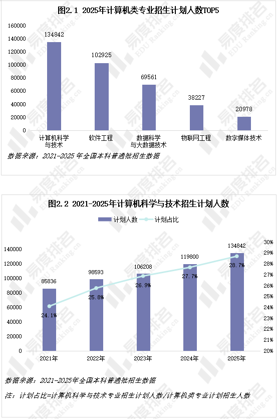 计算机科学与技术专业被视为计算机大类中的母体专业,2025年依然是计算机类专业的招生主力,招生计划数位居榜首。从图2.2来看,计算机科学与技术专业近些年招生计划数逐年递增,且增长计划占比每年都增长显著。