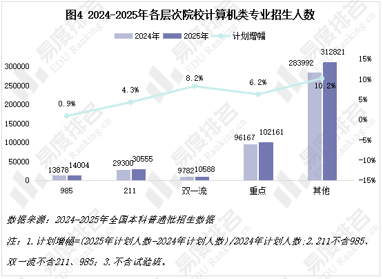 2025年各层次院校计算机类相关专业招生计划数呈现出普遍增长的态势,这体现了国家对信息技术领域人才的重视。计划增幅最大的是其他层次院校,其他层次院校依然是计算机类人才培养的主力。