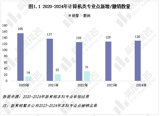 2020-2022年计算机类招生专业点新增数量逐年减少,撤销专业点数量逐年增加。2023-2024年计算机类新增招生专业点数量缓慢增加。新增速度放缓并不意味着计算机行业不再重要,而是我国高等教育从规模扩张转向质量提升的新阶段,避免低水平重复建设和教育资源浪费。