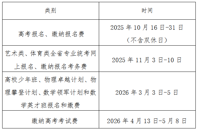 (二)考生完成信息填报和缴纳报名费。考生登录“考生信息填报系统”完成个人信息填报和缴纳报名费。所有考生都必须在全省安排的统一时间内(即2025年10月16日至31日,不含双休日。高校少年班、物理卓越计划、物理攀登计划、数学领军计划和数学英才班的报名信息采集及缴费时间集中安排在2026年3月3日至5日)完成信息填报和缴纳报名费,逾期不再受理,也不安排高考补报名。具体按以下程序和要求进行: