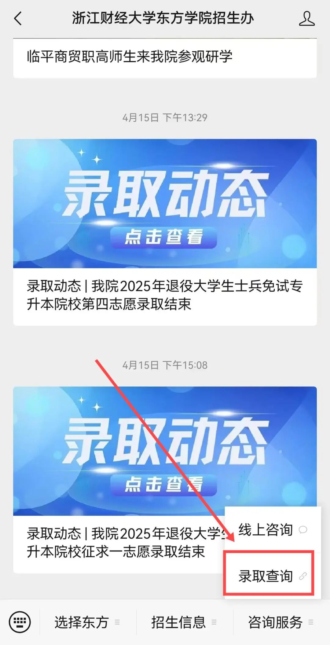 考生可以关注“浙江财经大学东方学院招生办”官方微信公众号,点击“咨询服务”菜单,再点击“录取查询”,按照其提示进行查询。