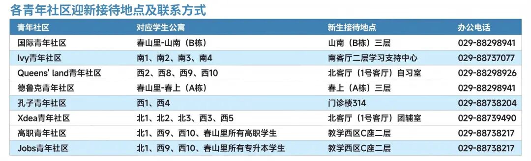 各青年社区迎新接待地点及联系方式