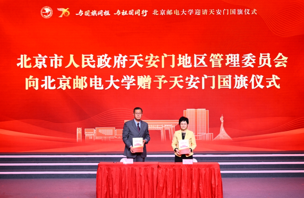 仪式现场举行了北京市人民政府天安门地区管理委员会向北京邮电大学赠予天安门国旗仪式。姚辉主任和续梅书记上台签署《国旗赠予协议》。