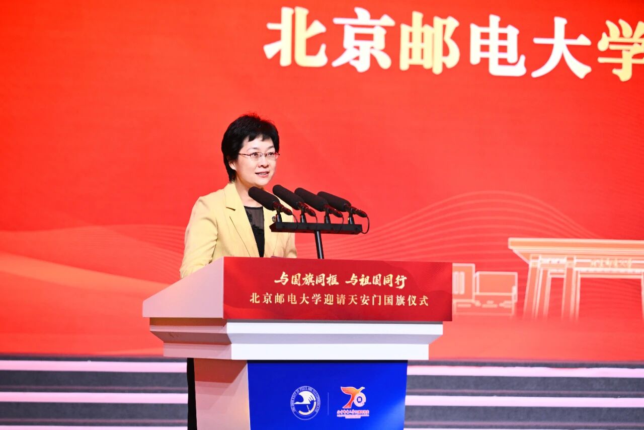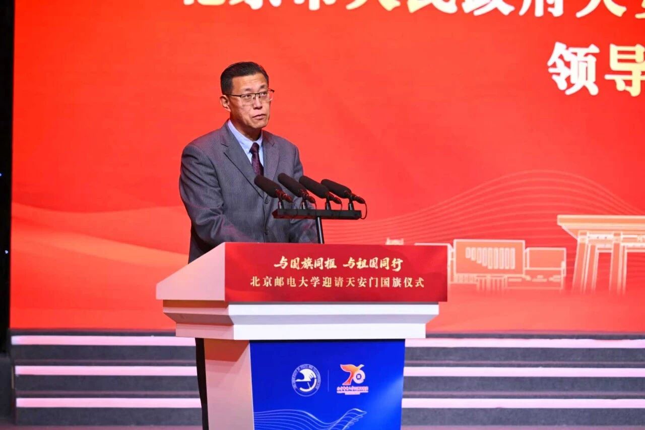 姚辉代表北京市人民政府天安门地区管理委员会向北京邮电大学建校70周年表示热烈祝贺。他指出,天安门国旗是国家典礼的“礼器”,每一面都具有唯一性,弥足珍贵,是蕴含特殊意义的爱国主义教育的载体。希望北京邮电大学能够精心保管,规范展陈,将国旗教育融入学校大思政课教育活动,拓展实践育人、场馆育人、典礼育人的新格局。希望全体师生从国旗精神中汲取奋进的力量,切实将这份荣耀转化为推动学校事业发展的强大精神动力,向着高质量建成具有信息科技特色的世界一流大学阔步前进。