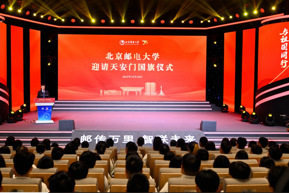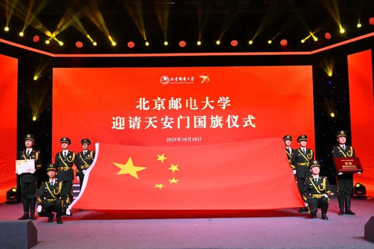 2025年10月18日清晨,我校西土城路校区、沙河校区、海南校区同步举行升旗仪式,共庆北邮70华诞,同抒爱国情怀。同时,300名师生代表在天安门观礼台观看升旗仪式,见证了五星红旗在天安门广场冉冉升起。当晚,降旗仪式后,学校将这面承载无上荣光、凝聚爱国深情的国旗迎请回校。