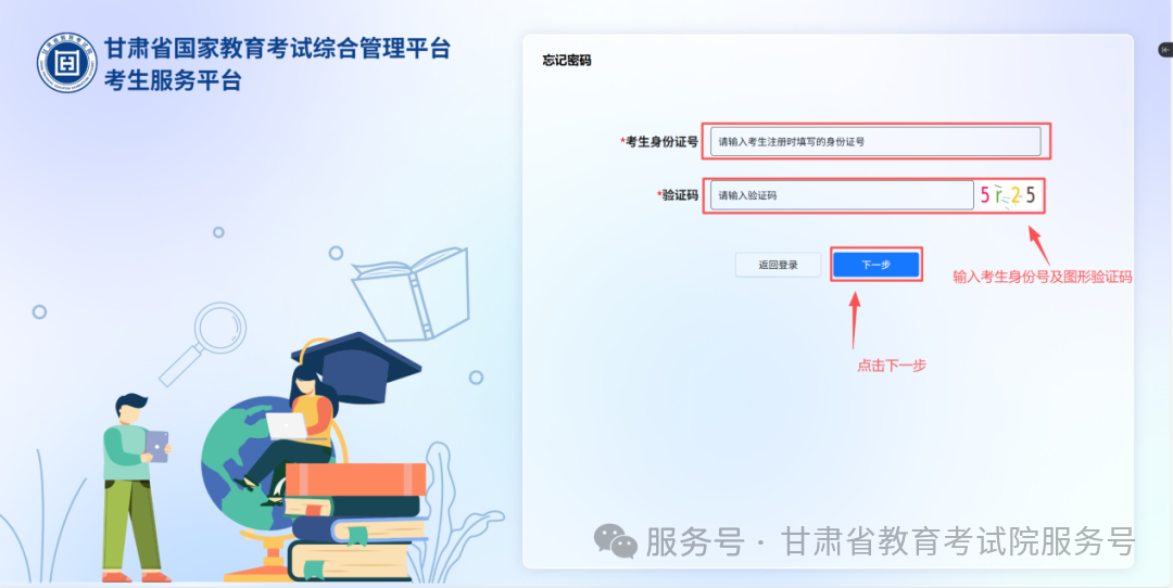 点击“忘记密码”后,输入注册时填写的考生身份证号及页面显示的图形验证码,点击 “下一步”。若系统提示 “考生未注册”,需返回登录界面完成账号注册;