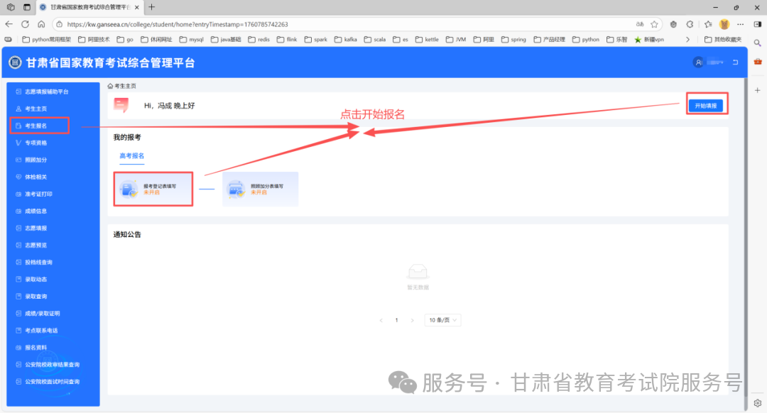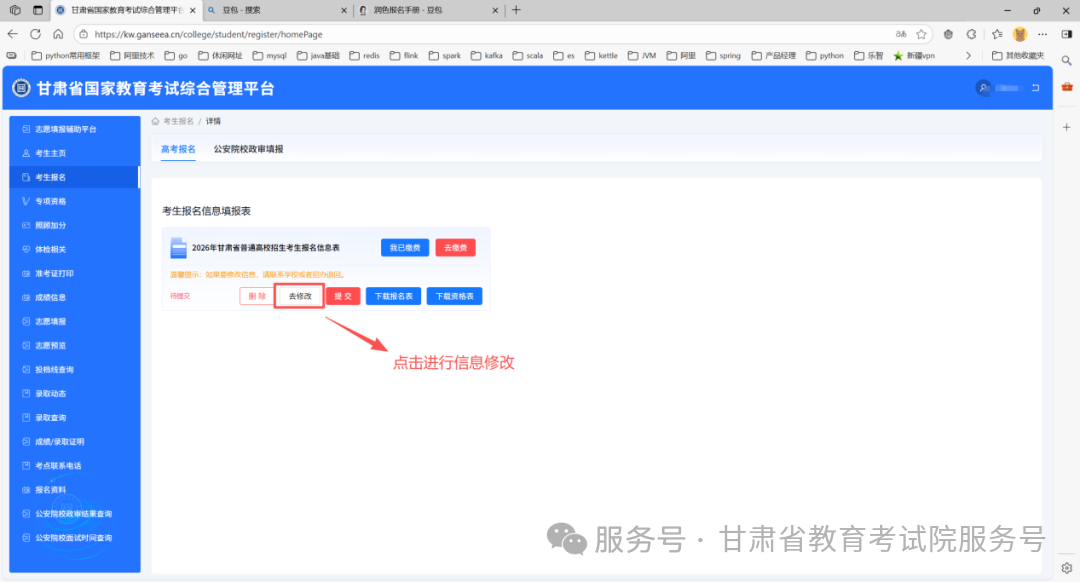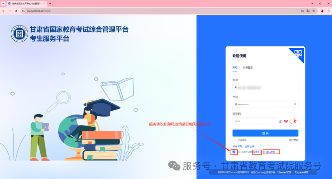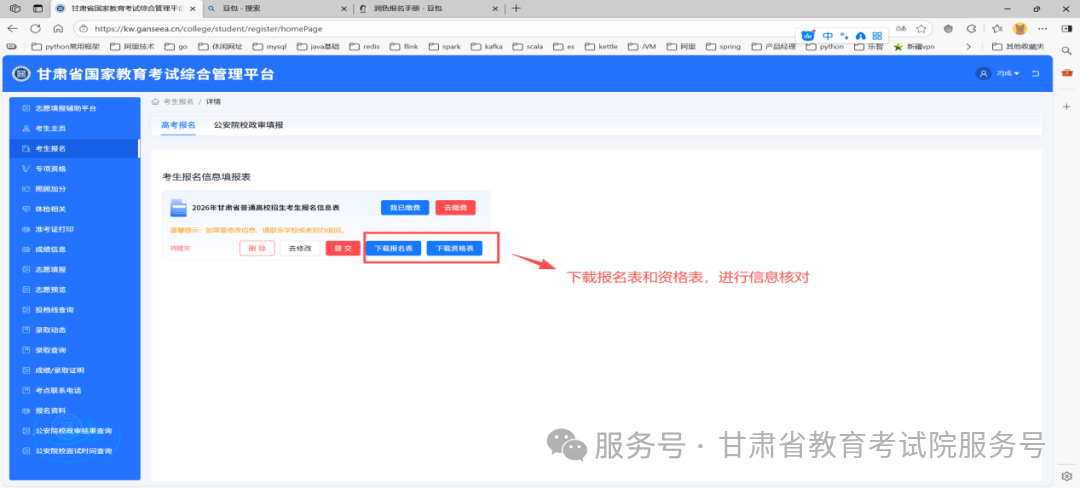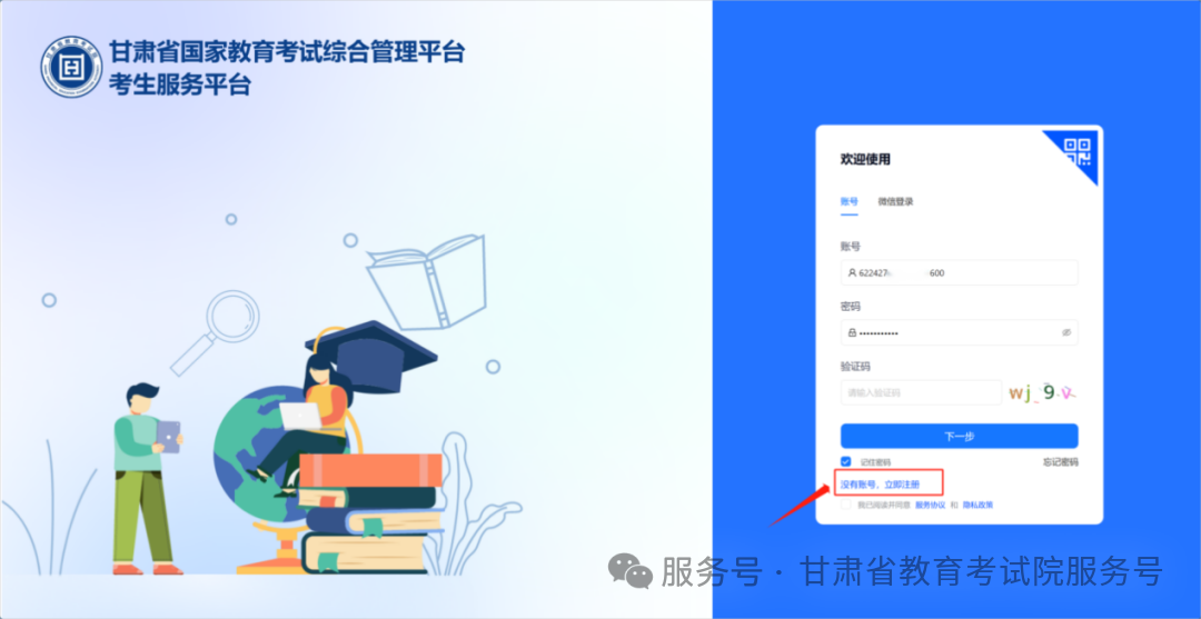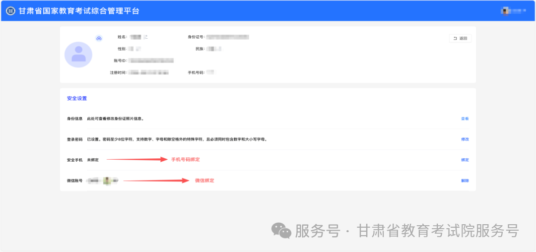 进入注册页面之后,根据页面提示进行注册信息填写,同时点击 “绑定微信账号”,先通过微信扫码关注 “甘肃省教育考试院” 微信公众号,再扫码完成微信账号绑定。后续部分高考相关通知将通过该公众号发送,且部分业务需绑定微信扫码操作。