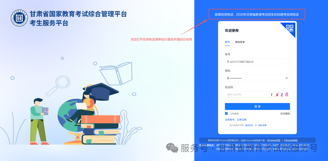 8.支持电话(1)政策类咨询:如遇到政策不清、审核等问题,请拨打各区县、市州教育考试招生机构电话咨询,咨询电话有2种查询渠道。未登录系统用户可通过登录界面上方提供的“2026年甘肃省教育考试招生机构高考咨询电话”表自行查阅。