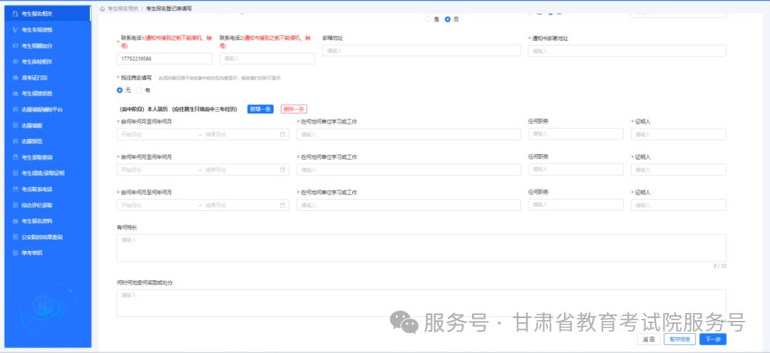 3.报名信息填写(1)在报名信息填报页面,考生需逐项填写个人基本信息、户籍类别、高中阶段简历、特长及获奖/处分情况等内容。(2)填写时需仔细核对证件原件,确保姓名、身份证号、性别等关键信息与原件完全一致,避免错别字或格式错误。(3)带 “*” 必填项需完整填写,选填项按实际情况补充;填写完成后务必仔细核对,确认无误再进行资格信息填写。(4)填写过程中可点击 “暂存信息” 保存数据,避免丢失;填写完成后仔细核对,确认无误点击 “下一步”,进入资格信息填写环节。