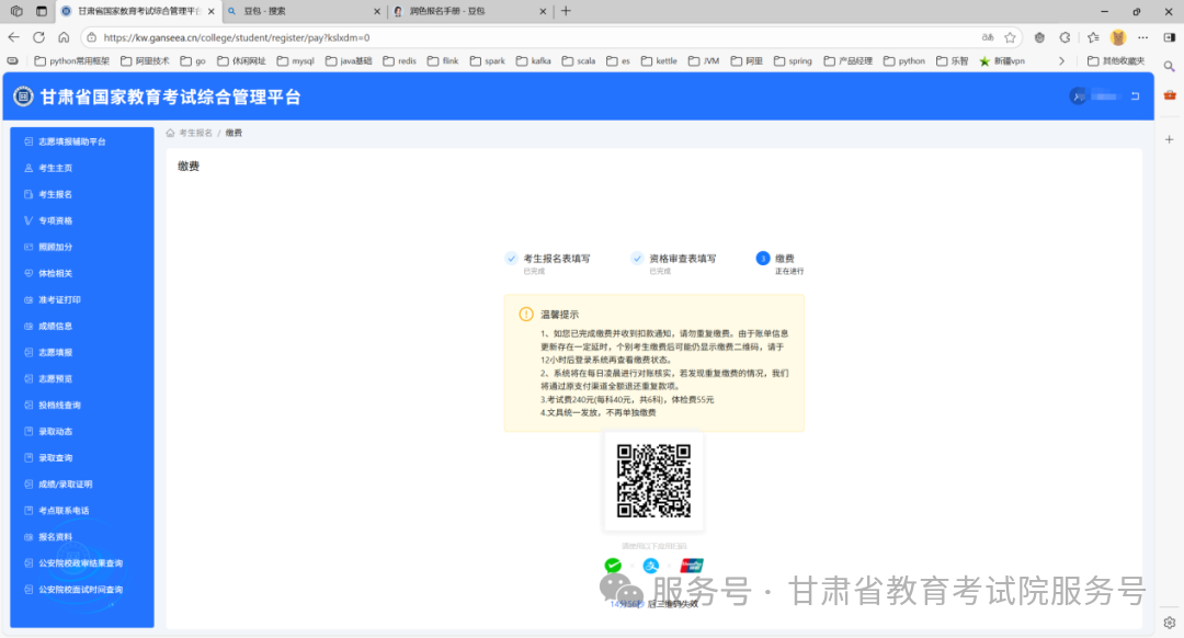 弹出二维码缴费页面,进行扫码缴费,支付微信、支付宝、银联,缴费成功之后系统会自动跳转到报名首页。