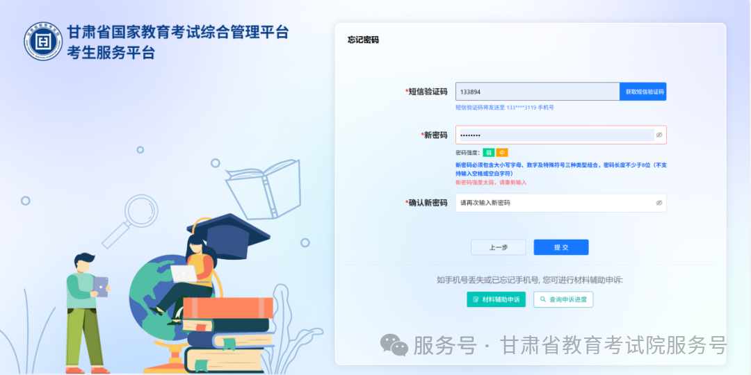 点击“下一步”后,系统将向您预留的手机号发送短信验证码。该验证码是验证本人身份的关键信息,务必由考生本人亲自查看并输入,严禁转发给任何他人,以防身份信息泄露或账号被他人操控。输入验证码后,设置新密码。密码设置规则:新密码必须包含大小写字母、数字及特殊符号三种类型组合,长度不少于 8 位,不支持输入空格或空白字符。