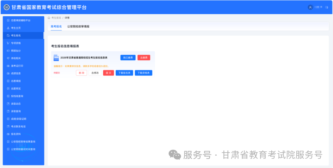 7.信息修改(1)未提交时:若核对草表发现错误,直接在报名系统点击 “修改” 按钮,修正错误信息后重新核对,确认无误再提交。(2)已提交时:提交后无法自行修改,需联系学校或当地招考办,申请退回报名信息,待信息退回后修正,修正完成后重新提交。