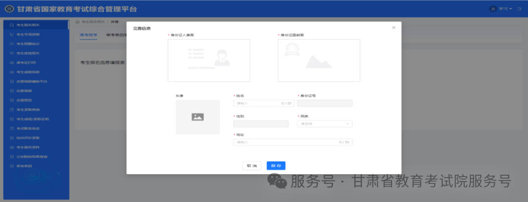 1.完善信息报名流程启动后,需先完成身份证照片上传与信息核对:(1)按系统提示,分别上传身份证人像面、国徽面照片;(2)系统自动识别身份证信息后,考生需仔细核对姓名、身份证号、性别、民族、地址等内容,确保与身份证原件一致;(3)确认无误后点击 “保存”,若身份证号识别不一致,需重新上传清晰的本人身份证照片。