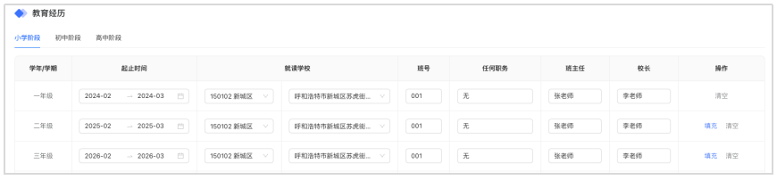 基本信息中,填报“本人户籍是否从自治区外迁入”为“是”或“是否是自治区外来务工人员随迁子女”为“是”的考生,需要录入“教育经历”信息。填报“教育经历”时系统支持快捷填充与清空操作,填充行和上一行内容保持一致,且支持修改。其中“起止时间”不进行自动填充。
