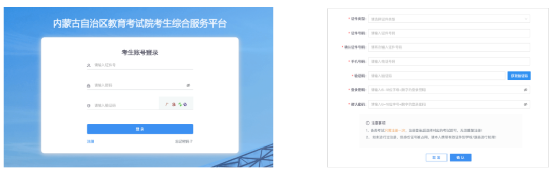 若使用此平台参加过“内蒙古自治区普通高中学业水平考试”等考试网上报名的考生,可使用已注册过的平台账号进行登录。未注册考生请点击“注册”按钮进行账号注册。考生注册时需要阅读注意事项,填写个人信息,确定无误之后点击“确认”。注册完成后返回首页登录。