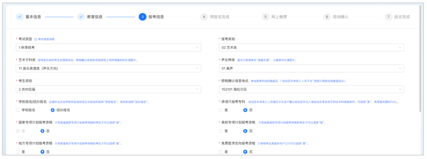 若报考类别为“艺术类”,且“艺术子科类”选择为“音乐表演类”、“音乐教育类”则需要录入曲目信息。