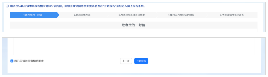 请依次阅读高考相关通知公告内容,包括“致考生的一封信”、“信息采集办法”、“考试违规处理办法摘要”、“使用二代身份证的通知”、“考生诚信考试承诺书”。阅读完成后,勾选“我已阅读并同意相关要求”,即可开始报名信息填报。