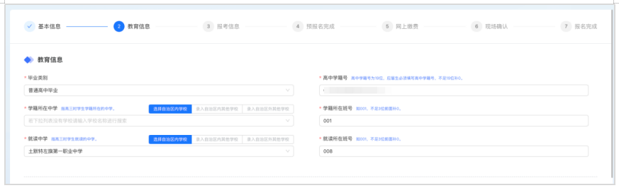按照页面要求,依次填写“教育信息”、“教育经历”及“学业水平考试成绩”信息。