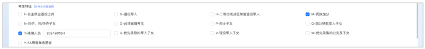 “考生特征”中勾选“残障人员”须录入“残疾证编号”。