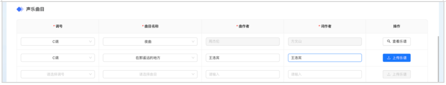 曲目信息可通过系统提供的筛选条件进行搜索并选择,若系统中存在的曲谱、乐谱信息与考生所选不一致,考生可点击编辑曲谱重新上传曲谱、乐谱后进行作词者、作曲者的编辑。