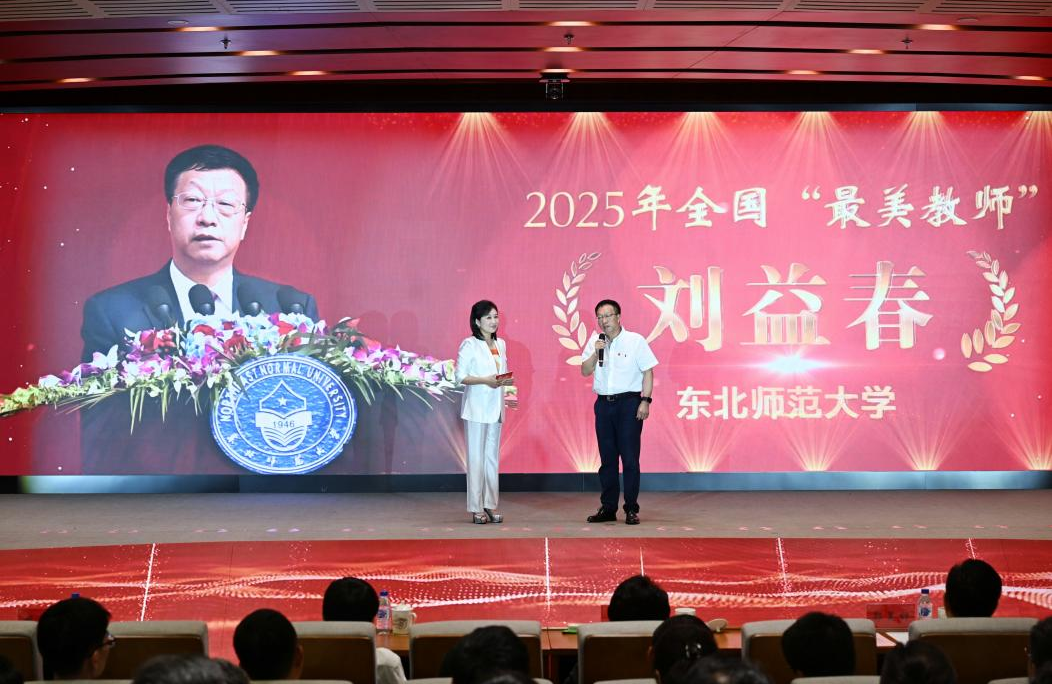 中国科学院院士、我校刘益春教授作为2025年全国“最美教师”获得者受到特别致敬,并在现场分享了践行“科研报国、教育兴国”的初心与担当。会上,2025年度吉林省“最美教师暨黄大年式好老师”、我校心理学院盖笑松教授也分享了他27年的教书育人经历。他们始终坚守为党育人、为国育才的神圣使命,在平凡岗位上恪尽职守、开拓奋进、无私奉献,集中彰显了吉林教师队伍的时代风采与崇高品格,使教育家精神在黑土地上熠熠生辉、薪火相传。