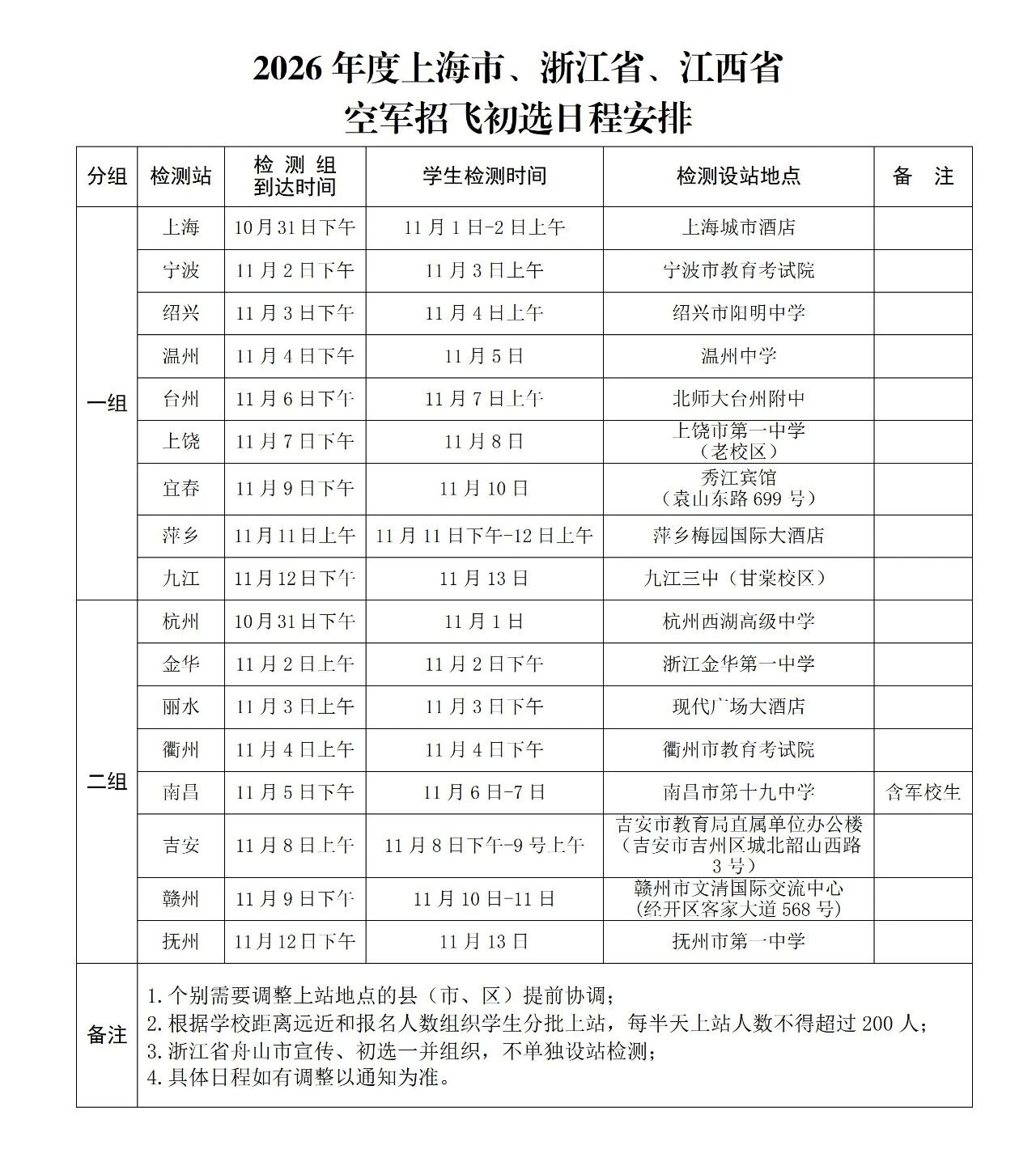 根据2026年度空军招飞工作安排,11月1日至11月13日,空军招飞局南京选拔中心将派初选组在上海市、浙江省、江西省各地市设站对报考空军飞行学员的军校生、高中生进行检测。
