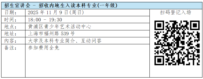 为让有意来港升学的高考生了解香港浸会大学在内地的招生政策,学校将举行本科专业招收内地学生上海宣讲会,欢迎有兴趣的高三学生﹑家长及中学老师参与。详请如下: