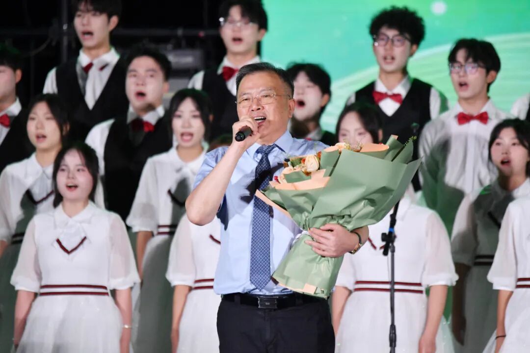 晚会现场最令人动容的一幕,当属李勇校长的真情献唱。当《多情的土地》那熟悉的旋律缓缓流淌,校长沉稳而醇厚的嗓音,将对家国故土的眷恋娓娓道来,如溪流漫过心田,深深感染着在场的每一位师生。随后,《我的祖国》那激励了一代又一代人的经典曲目响起,熟悉的音符仿佛具有魔力,瞬间点燃了全场的热情。激昂真挚的歌声中,寄托着李校长对祖国母亲炽热而深情的热爱,那每一个音符都饱含着对祖国山河的赞美与祝愿,也承载着他对全体新生的殷切期望,希望大家厚植家国情怀、学会知行合一,以青春奋斗致敬伟大事业、伟大时代和伟大国家 。