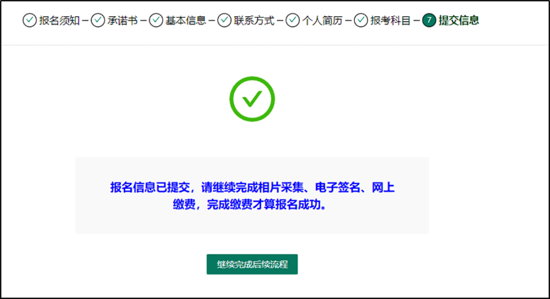 至此,考生网上报名流程完毕,考生填报的报名信息不能再做修改。如个人报考信息填报错误,应主动联系县级招考机构,并按要求提交书面申请。