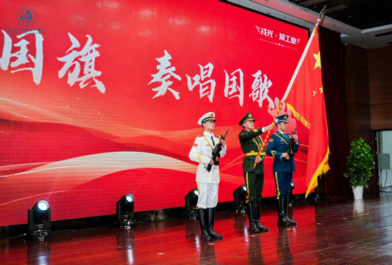 下午2时,国旗护卫队队员擎着鲜艳的五星红旗,登上主席台,雄壮的《义勇军进行曲》在千人报告厅奏响,全体与会人员高唱国歌,并向国旗敬礼。