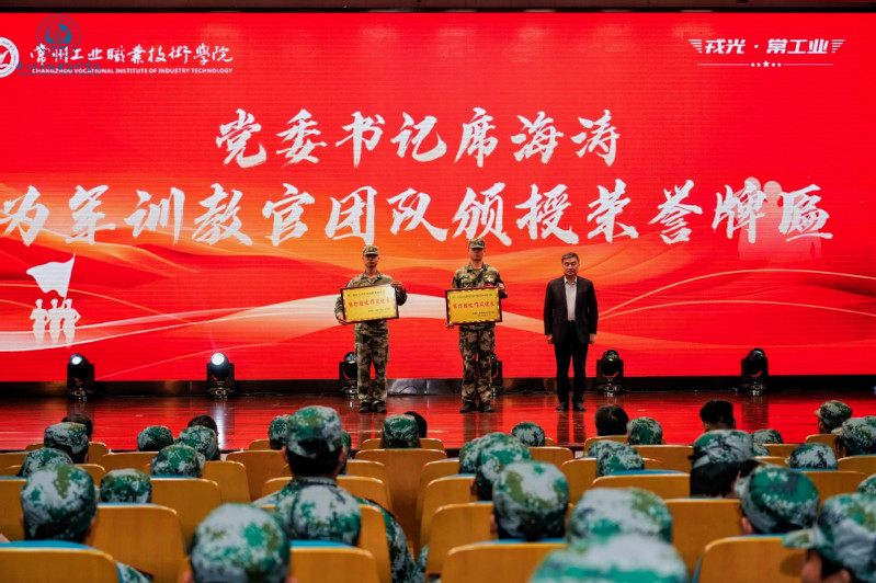 总结表彰大会上,党委书记席海涛代表学校向2025级军训教官团队负责同志颁发荣誉牌匾。