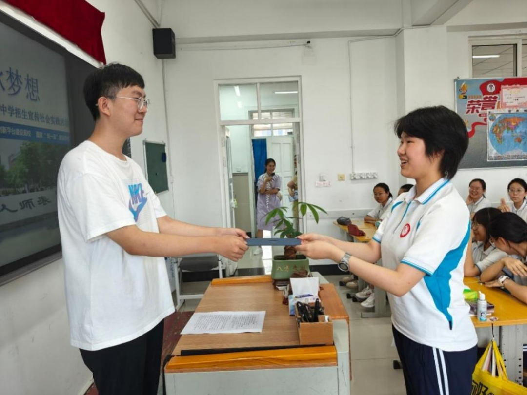 互动时他们问得很细:“社团会影响学习吗?”“师范专业要学什么?” 我一一解答,最后把东师的书签和明信片送给他们时,像递出了一把 “钥匙”—— 希望他们能凭着这把钥匙,打开未来的门。离开时回头看,教学楼的窗户亮着灯,忽然觉得:我们带来的不是 “信息”,是让他们相信,“你向往的远方,真的能走到。”